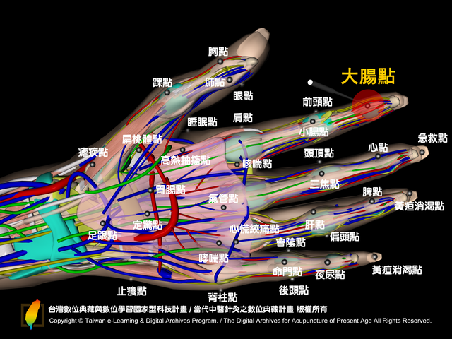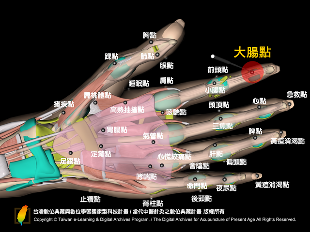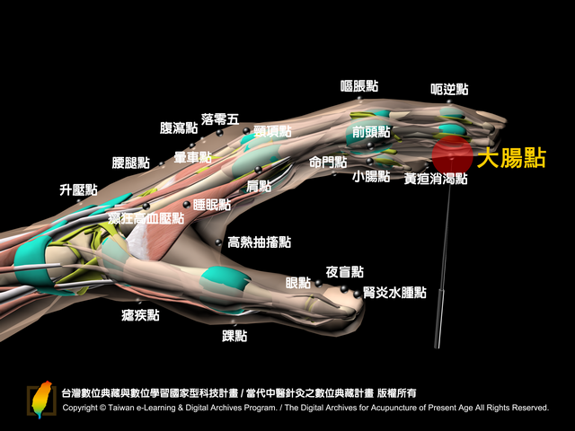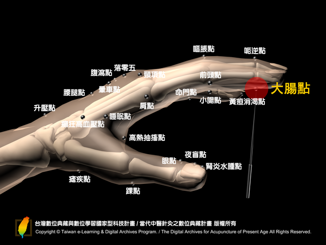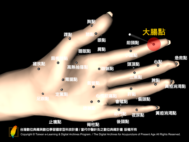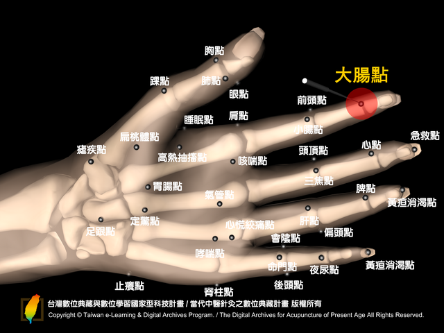 大腸點:位於掌面,食指遠端指關節橫紋(從指尖數來第一個橫紋)之中央點。