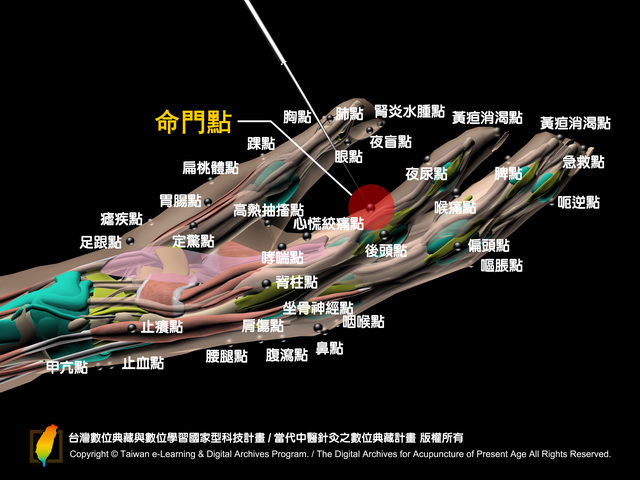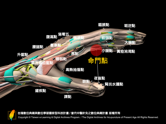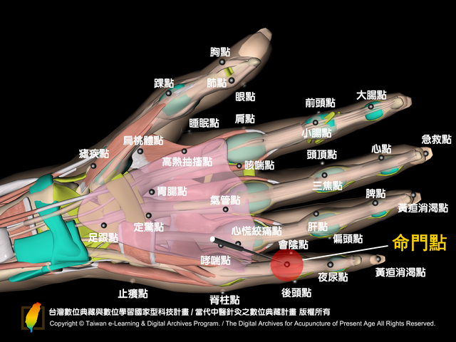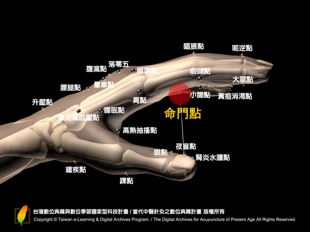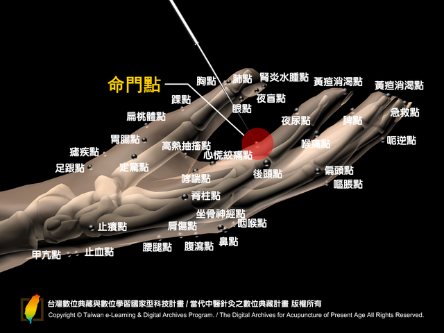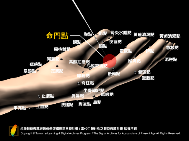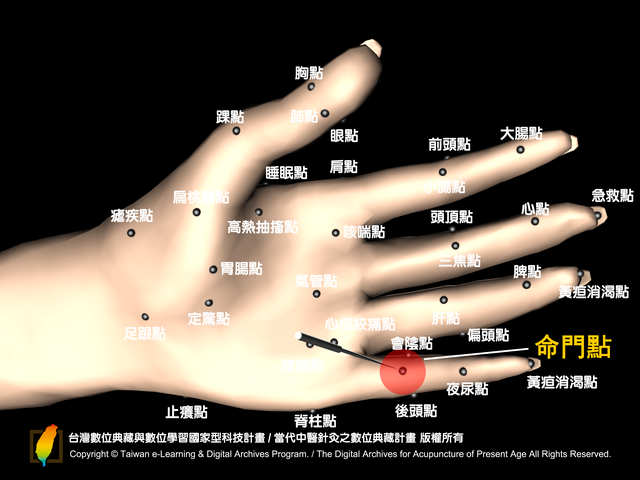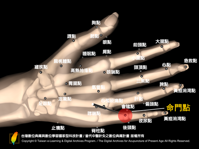 【臨床配伍】:遺尿: (十四經穴)神門、少府。 (手針新穴)腎點、命門點、頭頂點、後頭點。 |